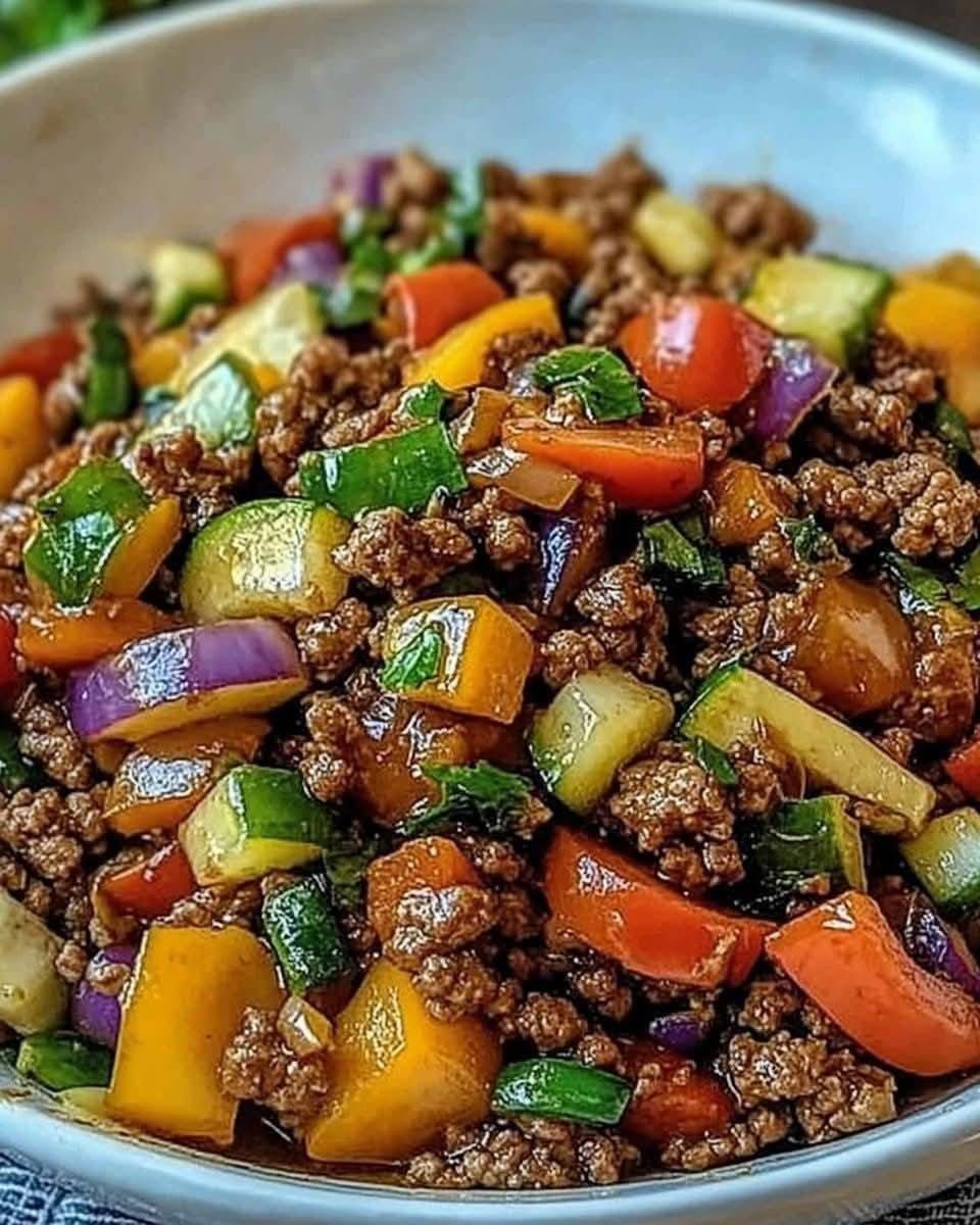 The Beef Stir-Fry with Vegetables is a simple, quick, and flavorful recipe. This dish combines tender ground beef with a variety of crunchy vegetables, creating a balanced meal that will delight the whole family. Soy sauce adds a perfect umami touch to enhance the flavors, while sesame oil adds a slightly smoky note. This dish is ideal for a quick dinner or a light yet delicious meal.
