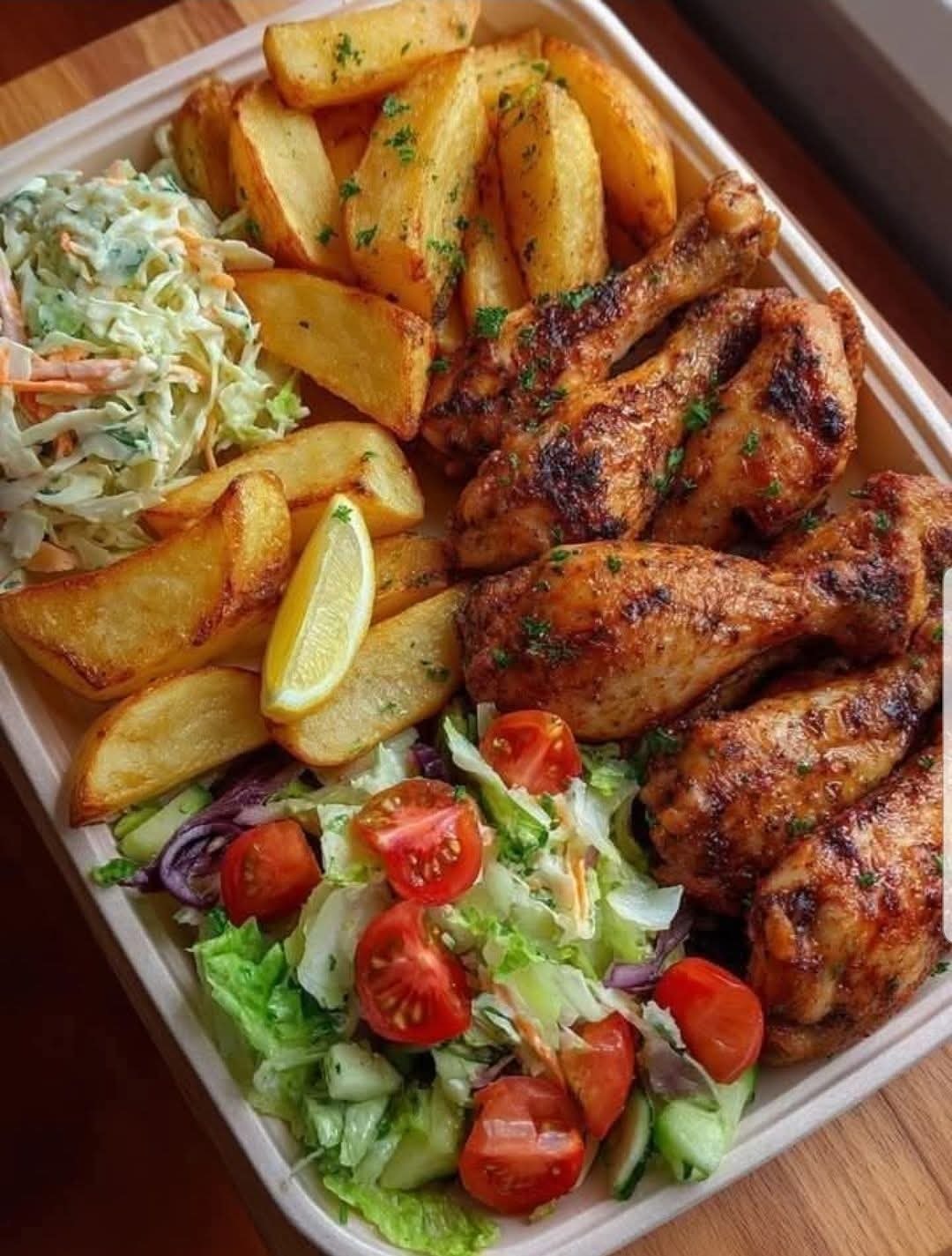 Looking for a meal that’s packed with flavor, variety, and satisfaction? This **Chicken Drumsticks, Potato Wedges, Greek Salad, Coleslaw, and Lemon Wedges** combo is a true crowd-pleaser that balances crispy, savory, fresh, and tangy all on one plate. Whether it’s a weekend family dinner, a casual get-together, or a fun picnic, this meal hits all the right notes.